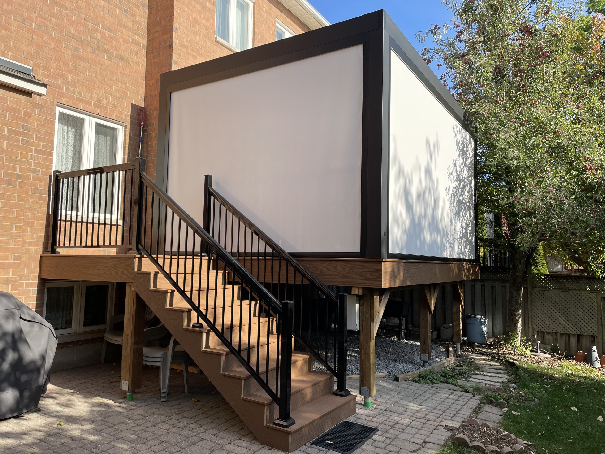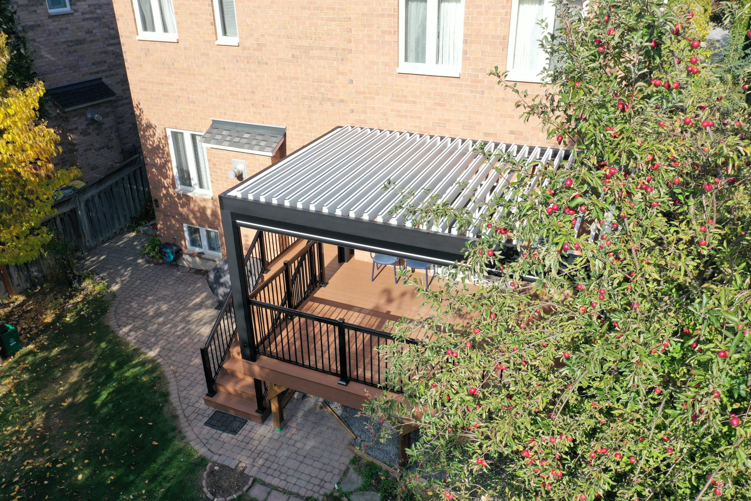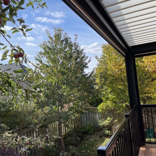 This Richmond Hill project features a custom elevated deck integrated with a premium motorized aluminum louver pergola. The design combines high-performance composite decking with adjustable louvers that provide precise climate control, extending the usability of this outdoor space throughout the seasons.